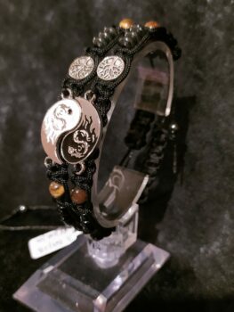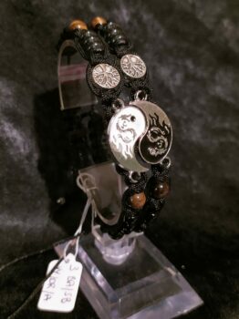 Hématites, oeil du tigre et arbre de vie entourent le connecteur central Yin et Yang gravés d’un Dragon (symbole de Force, Courage et Chance)