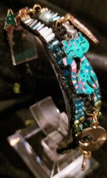 Une rivière de perles de rocailles d’un dégradé de couleurs bleu, doré, rose  et blanc entoure le connecteur central  » chat », symbole de la Liberté.