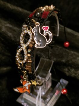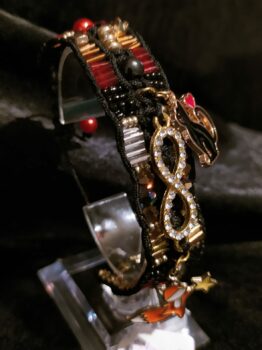 Une rivière de perles de rocailles de couleurs rouge, argent, doré et noir entoure le connecteur central » infini », symbole de l’éternité et l’amour pour toujours
