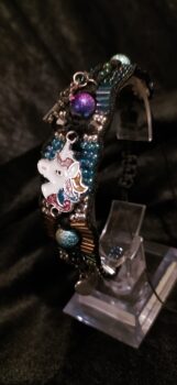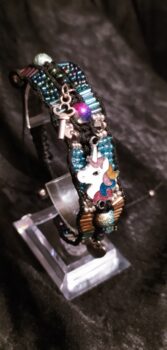 Une rivière de Perles de rocailles de couleur bleu, argenté et multicolor entoure la « Tête de la Licorne » à la crinière multicolore, Symbole de pureté, de sagesse et de force et magique.